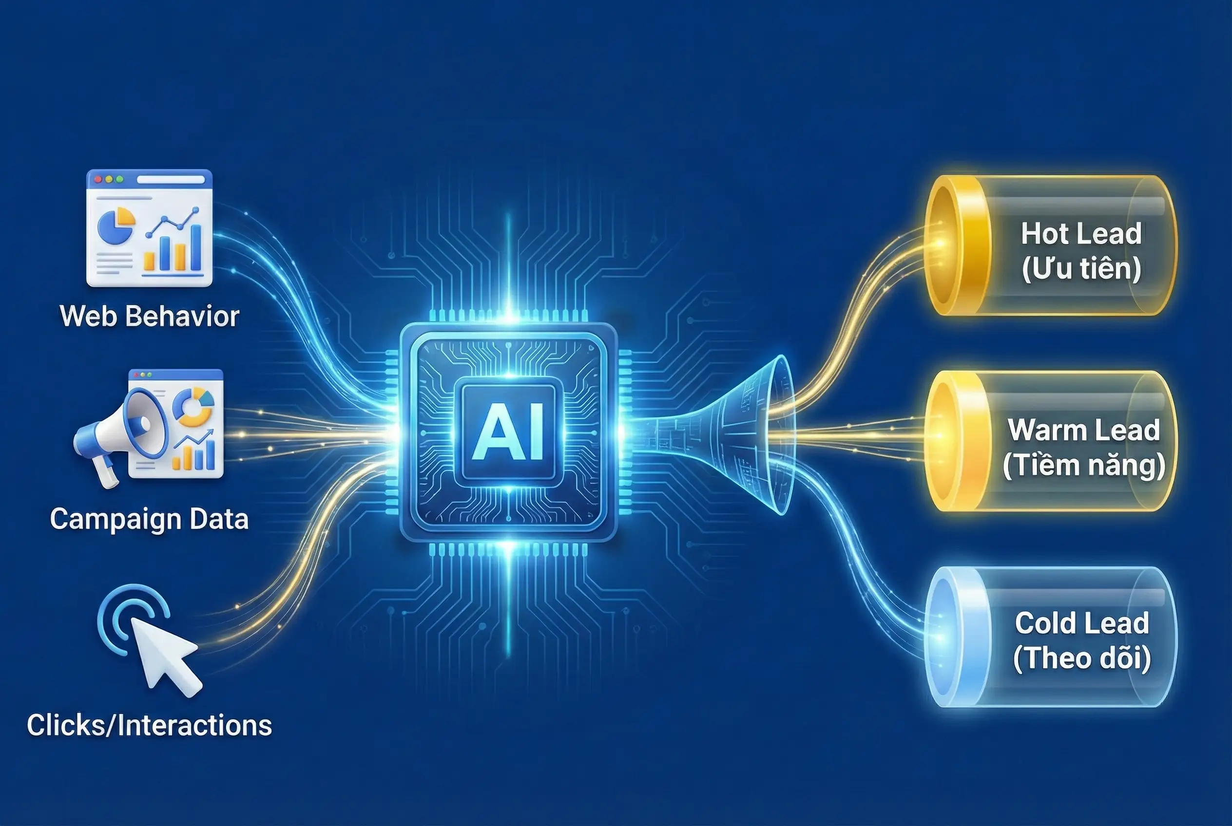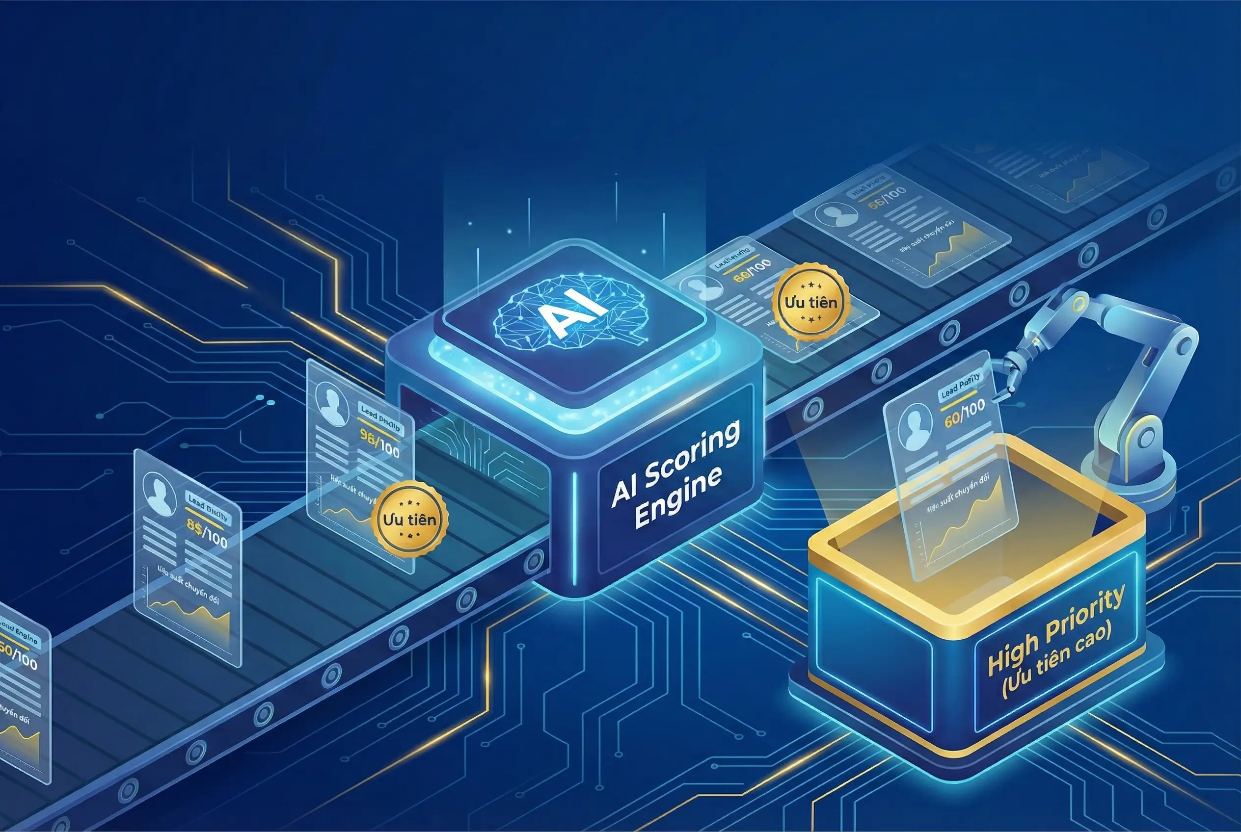 Loại bỏ hoàn toàn việc “đoán mò” trong bán hàng. Hệ thống AI tự động chấm điểm (Lead Scoring) và nhận diện khách hàng có ý định mua cao nhất. Giúp đội ngũ Sales của bạn tập trung nguồn lực vào đúng 20% khách hàng tạo ra 80% doanh thu, rút ngắn chu kỳ chốt đơn xuống tối đa.