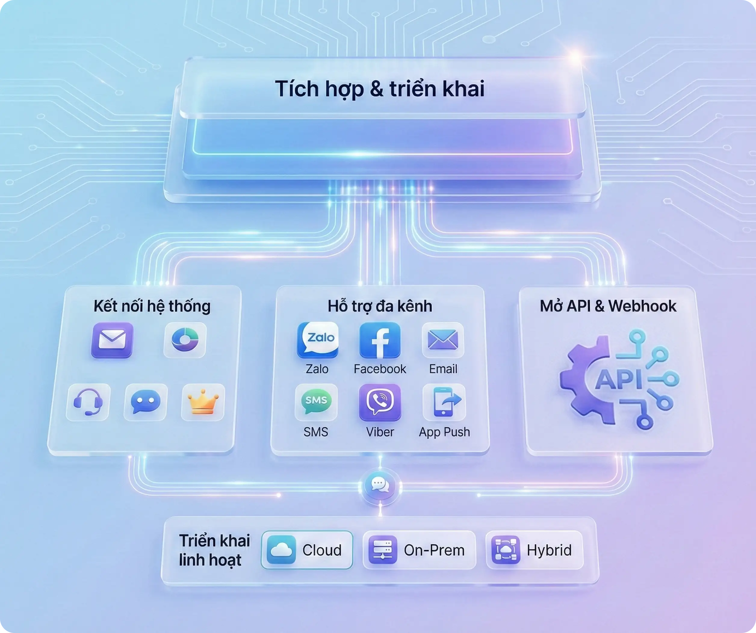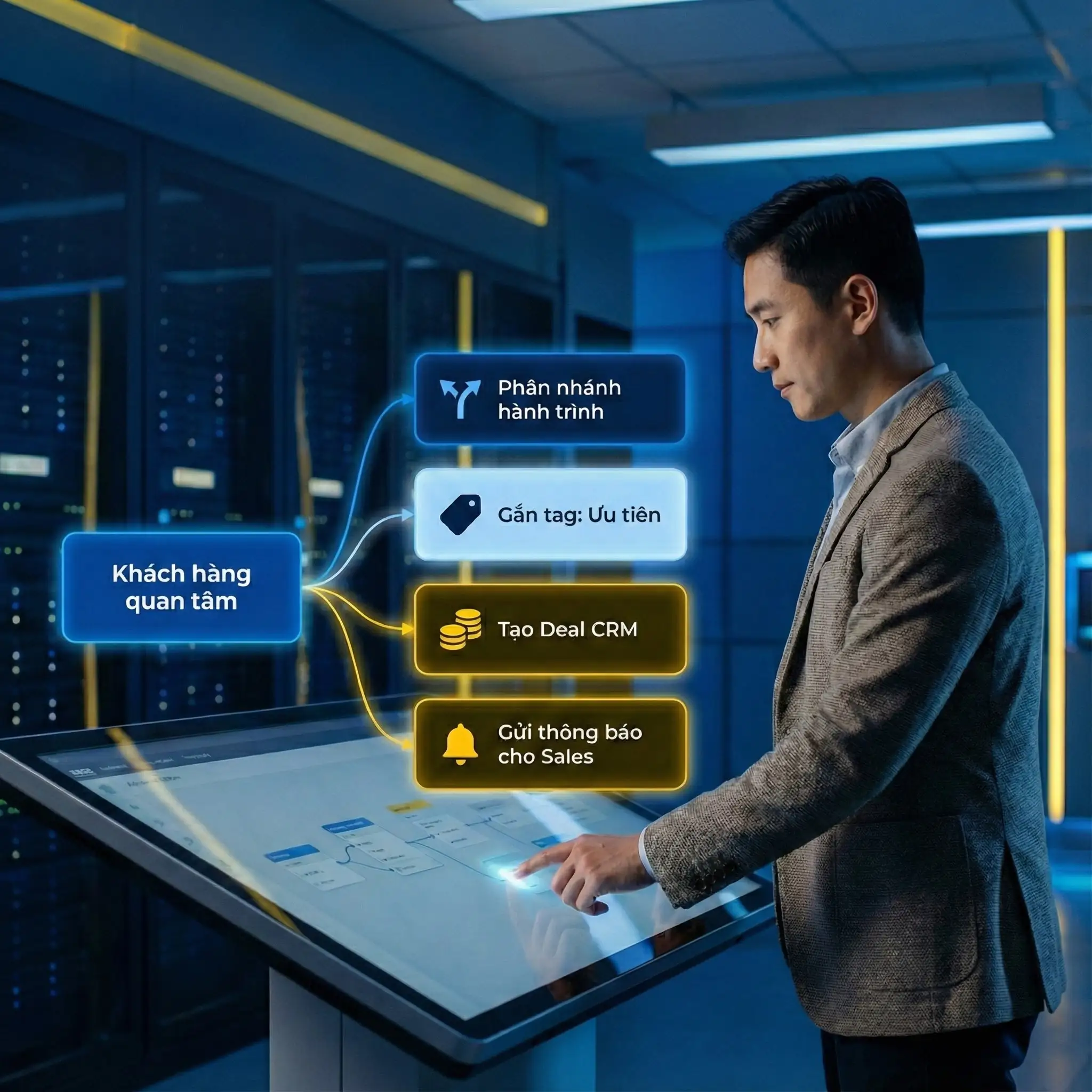 Loại bỏ thao tác tay, workflow kéo-thả, rẽ nhánh thông minh, bot-to-human chớp nhoáng, kích hoạt chiến dịch và chăm sóc tự động, giữ SLA luôn xanh, báo cáo hiệu quả chiến dịch minh bạch.