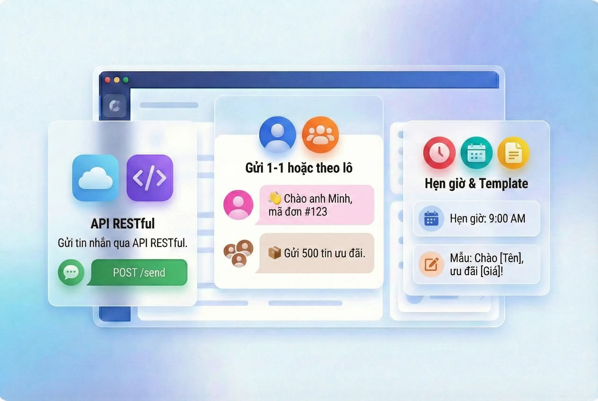 Gửi tin nhắn OTP, cảnh báo, mã khuyến mãi, chăm sóc khách hàng; tracking trạng thái; hỗ trợ Unicode